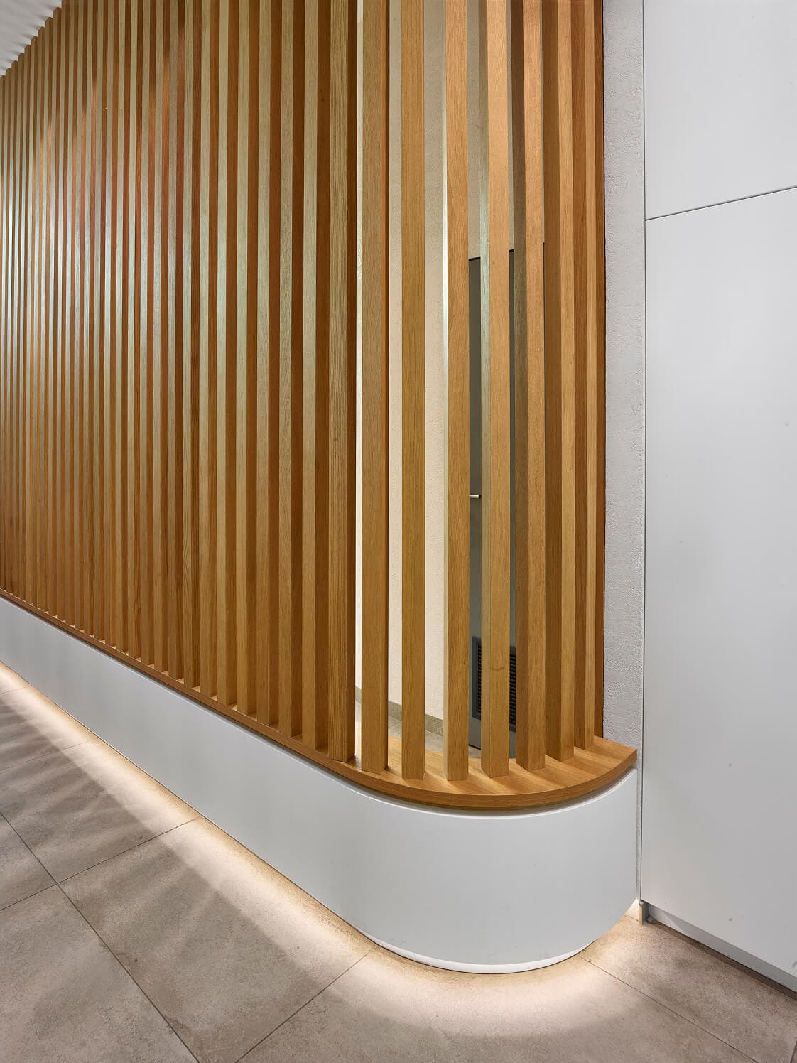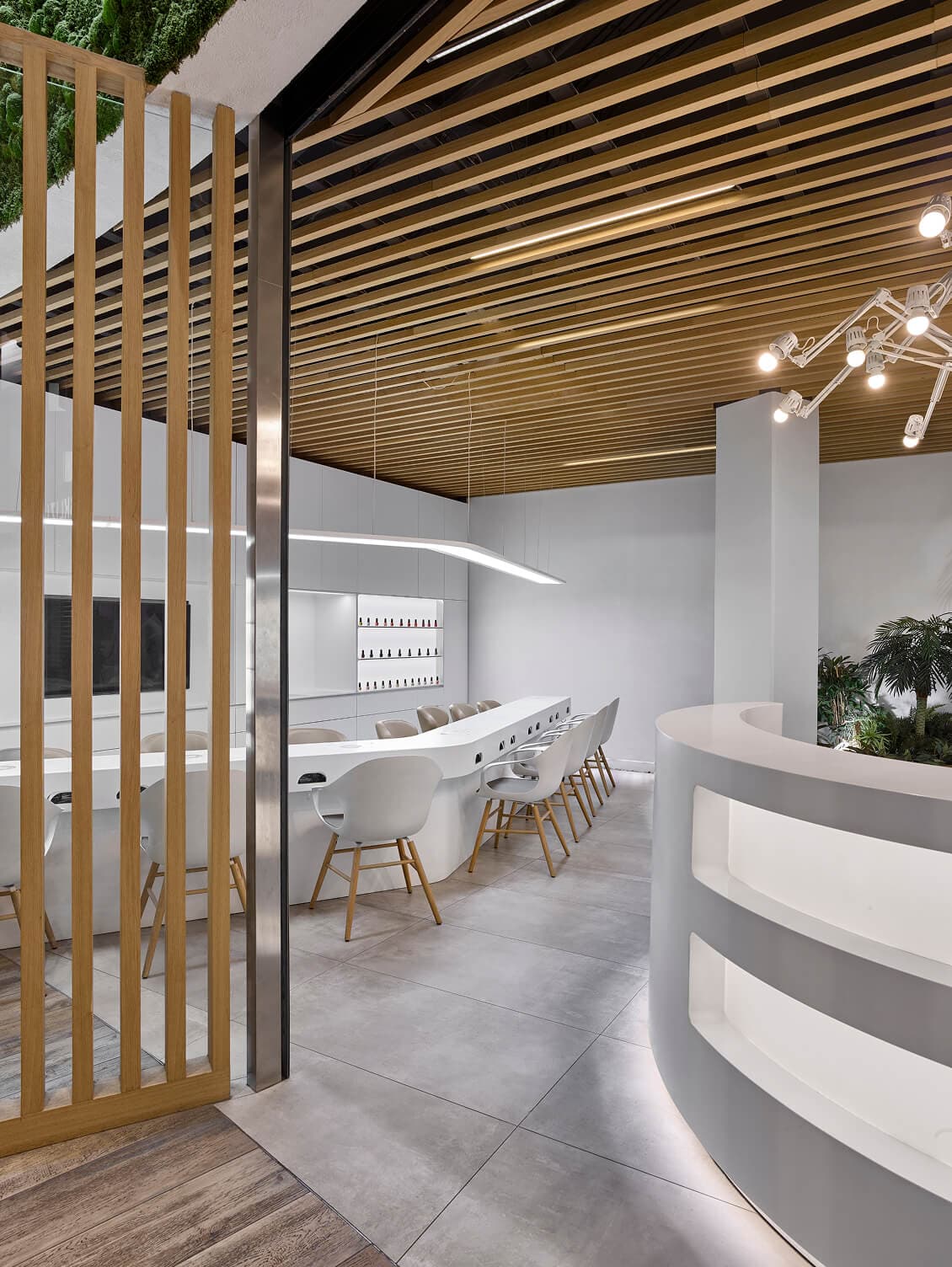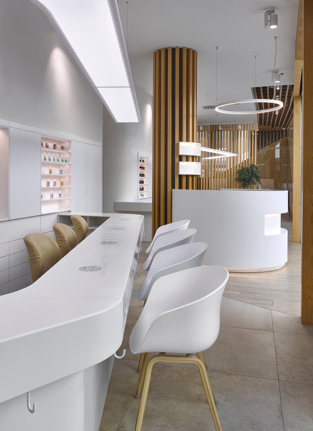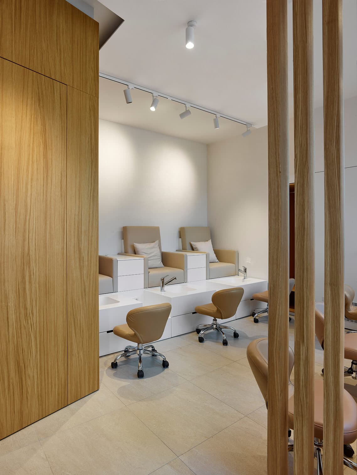 In the center of the space is a circular reception, from which pathways lead to the individual treatments. The radial direction is reflected in the choice of lighting above the reception. The distinctive character is defined by the bold division between the cubicles: partitions made of delicately shaped aluminum create striking visual layers. The unique aesthetic of the wooden slats is incorporated into the ceiling design, allowing for subtle interaction with light and ventilation.