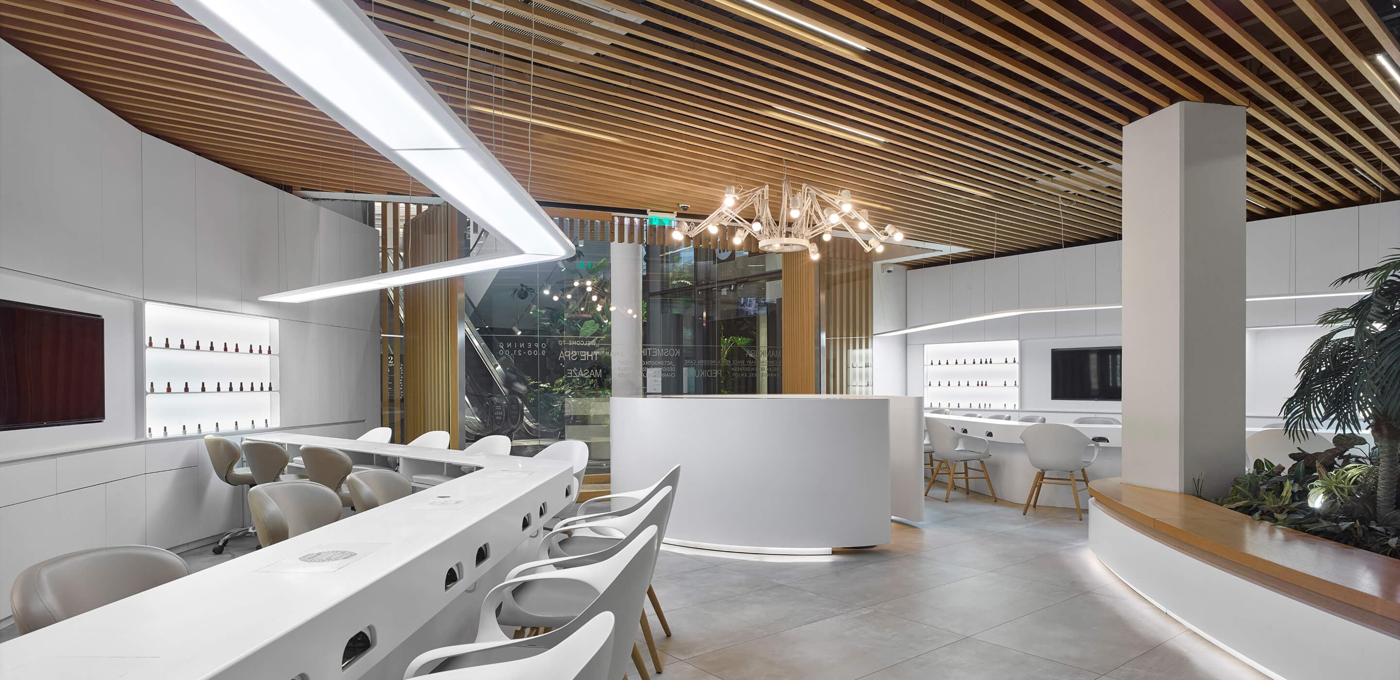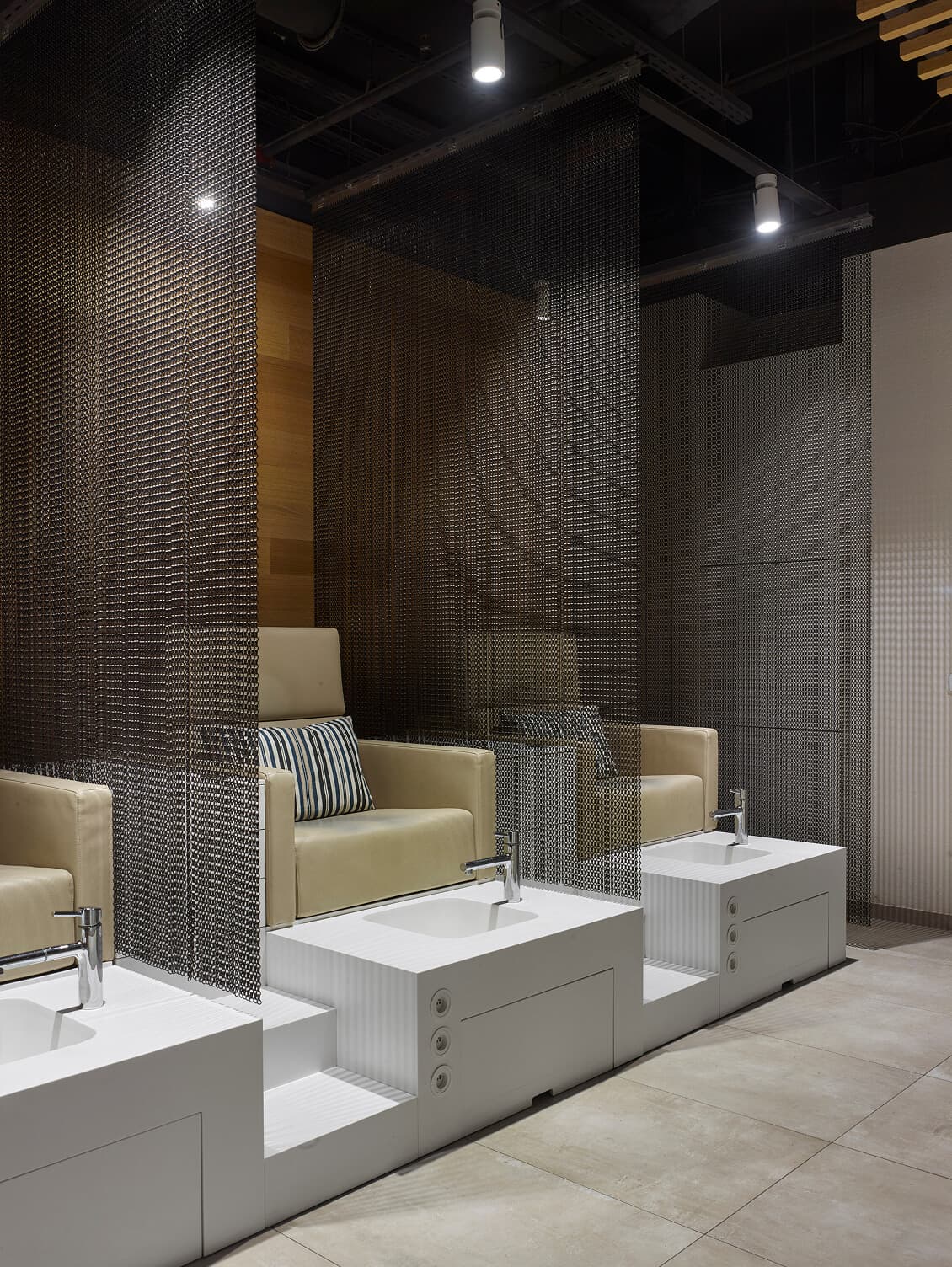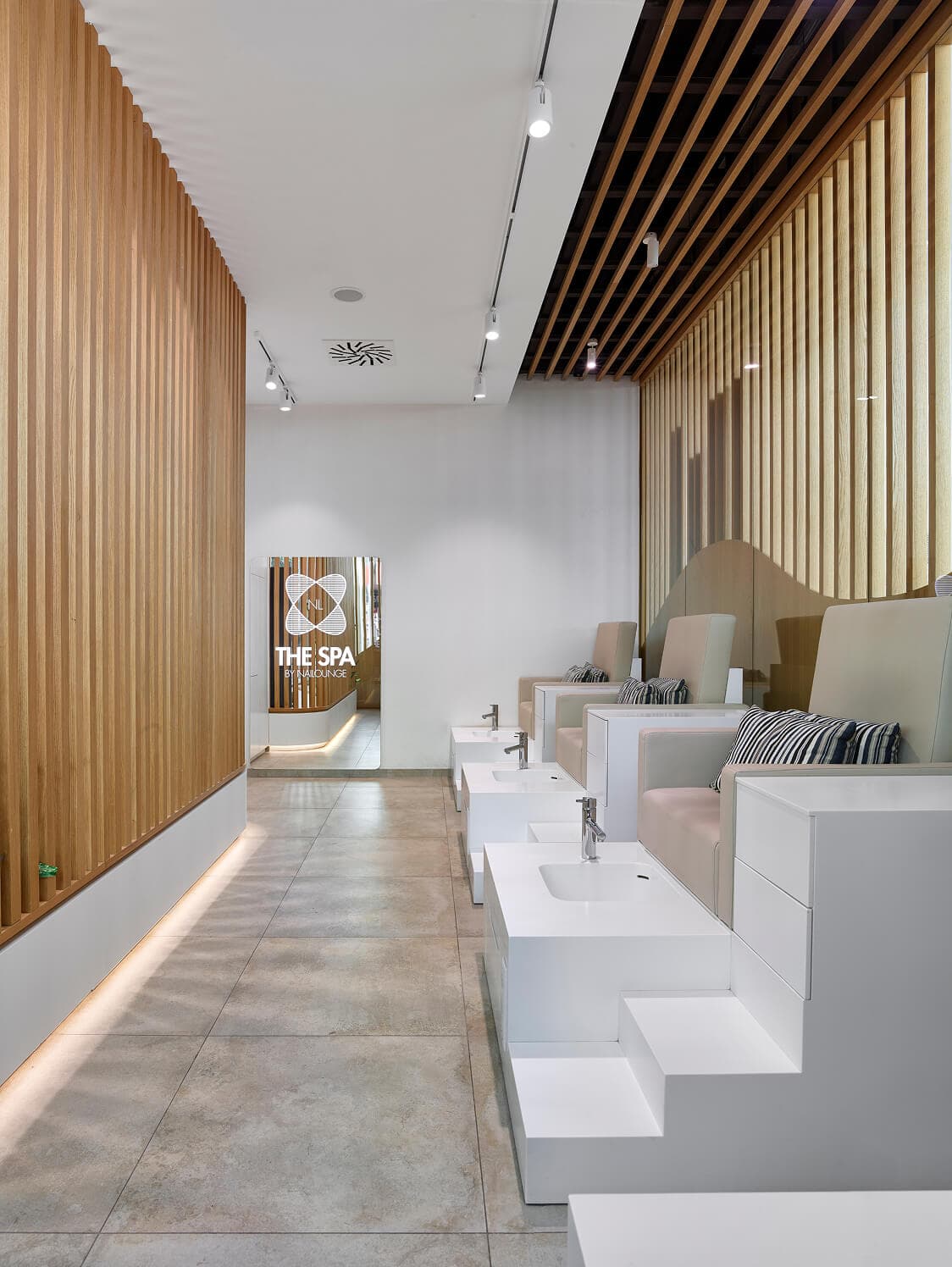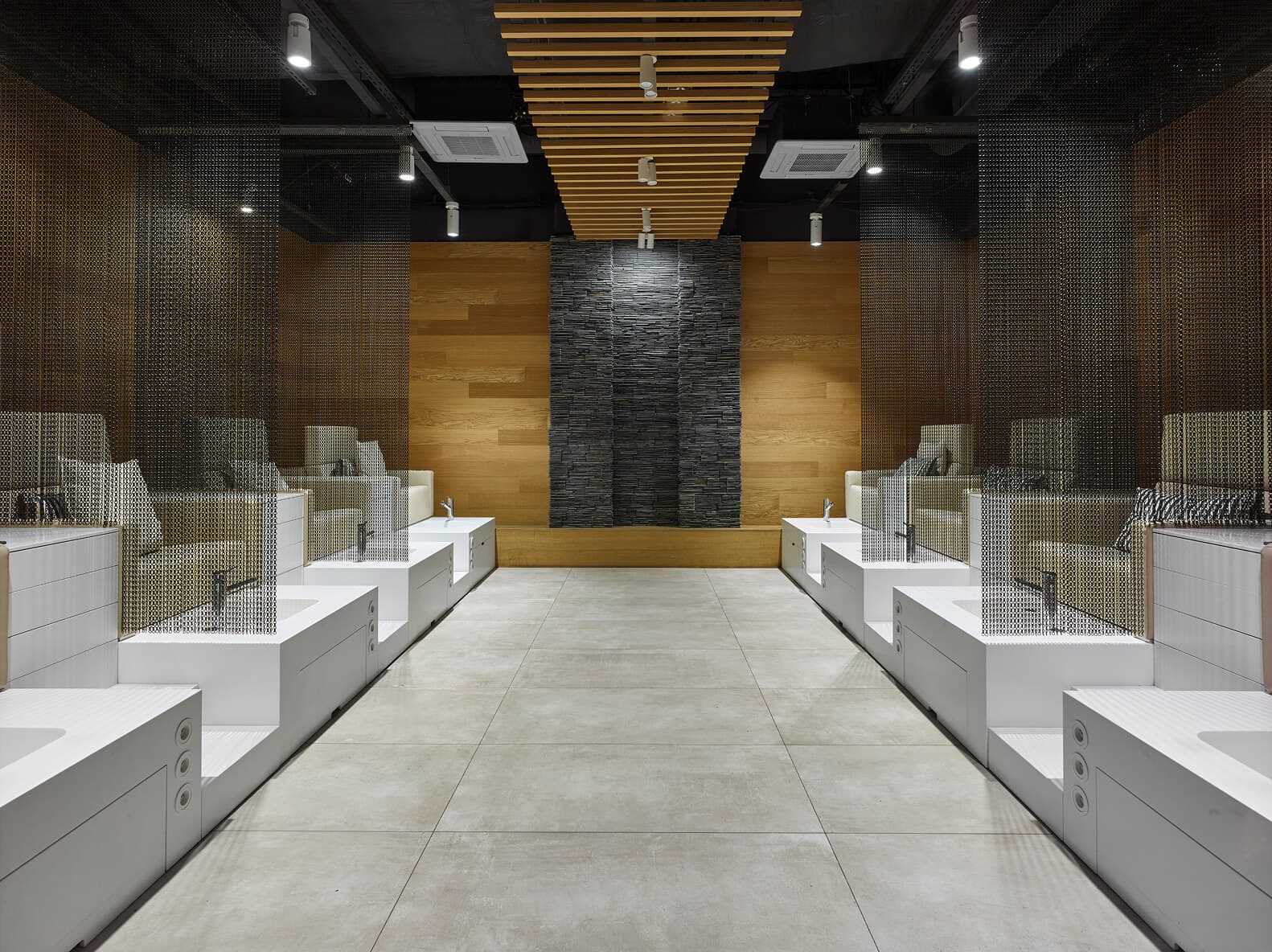 In the center of the space is a circular reception, from which pathways lead to the individual treatments. The radial direction is reflected in the choice of lighting above the reception. The distinctive character is defined by the bold division between the cubicles: partitions made of delicately shaped aluminum create striking visual layers. The unique aesthetic of the wooden slats is incorporated into the ceiling design, allowing for subtle interaction with light and ventilation.