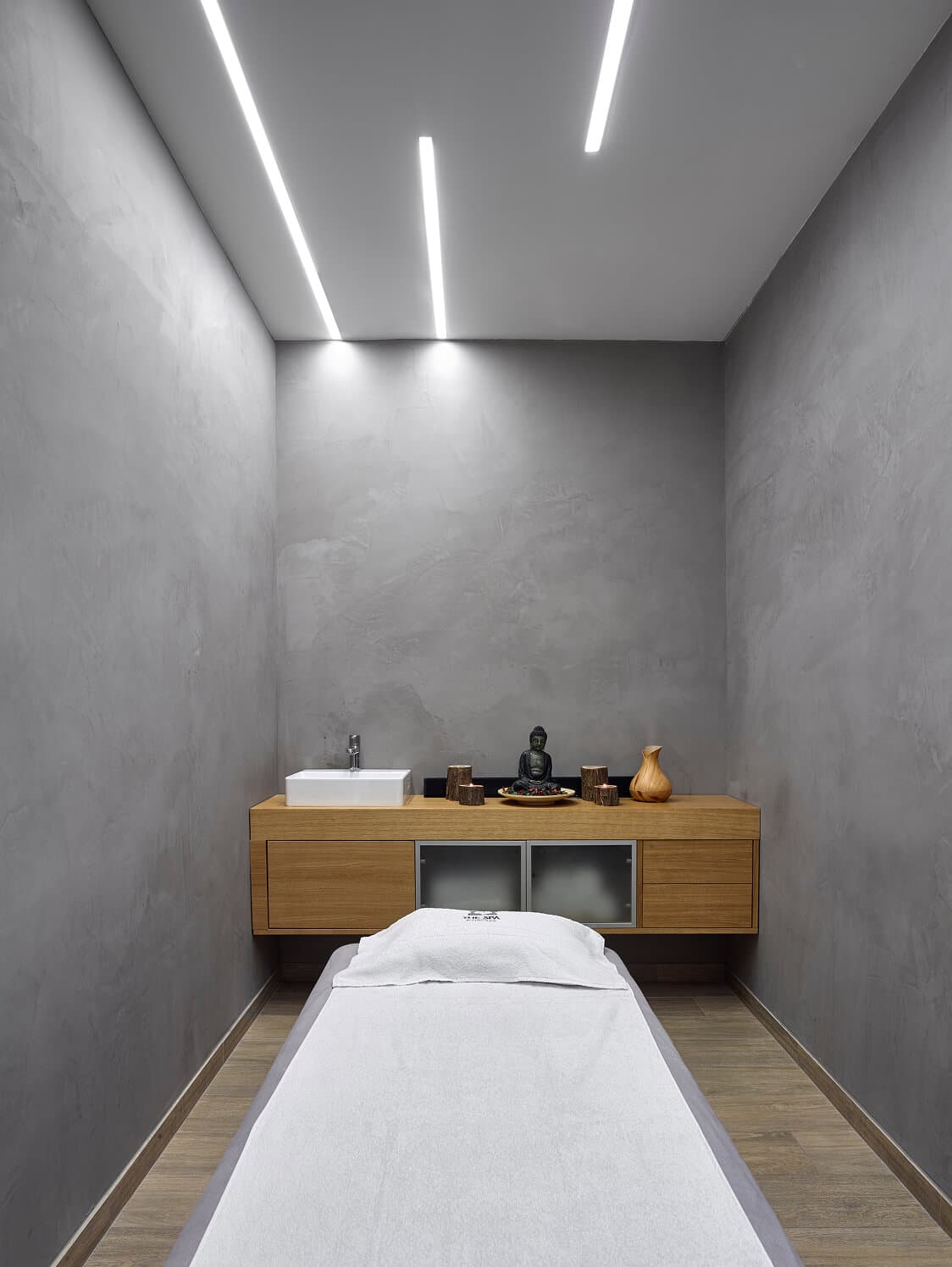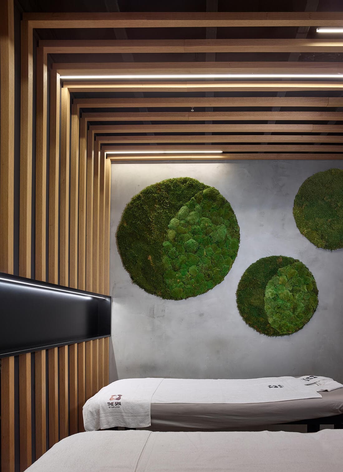 The natural material’s color and texture are complemented by white, which brightens the interior while ensuring a sense of cleanliness and clarity. For more intimate treatments, a semi-enclosed area behind a visual partition offers privacy without fully closing off the space.In Vaňkovka, the rounded shapes of the furniture and fixtures are highlighted by a striking circular light, while green plants bring vibrancy and a sense of calm to the interior.