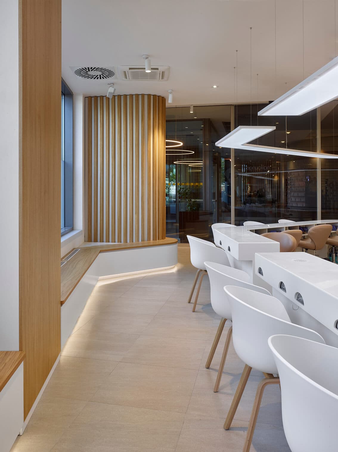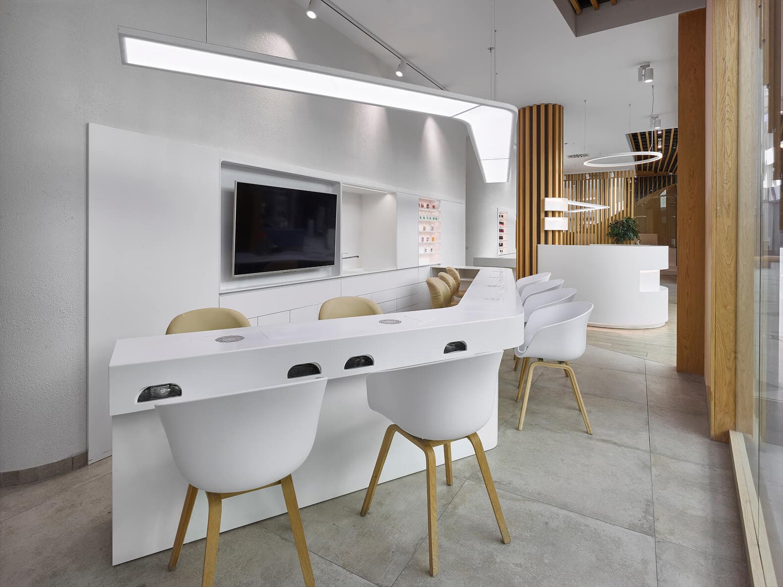 The limited space of the establishment invited a creative approach. The circular reception desk appears to dance around the adjacent column, while the curved light ramp and circular fixture amplify the sense of fluidity and motion. Its wooden slatted base forms a gentle light niche, anchoring the composition. Despite the full-length window display along the façade, the space maintains a surprising sense of intimacy.