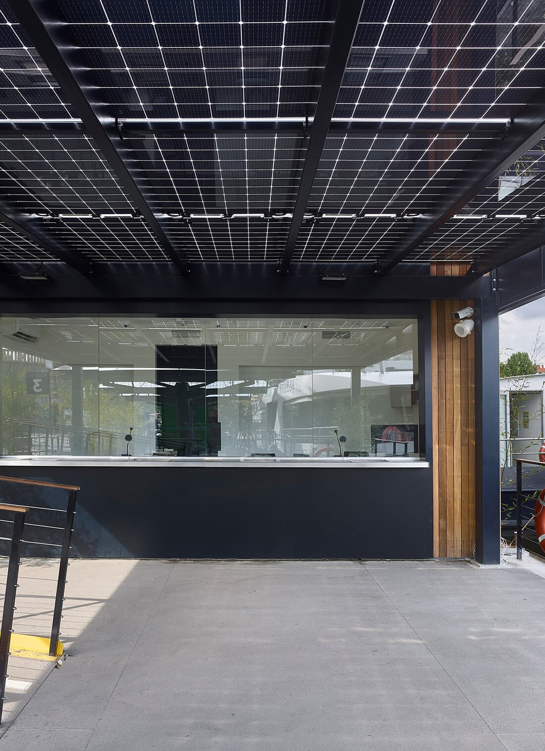 The floating offices for the operational team mirror the boat’s functional design, featuring sustainable materials selected for their performance and technological innovation — such as glass that doubles as a solar panel.