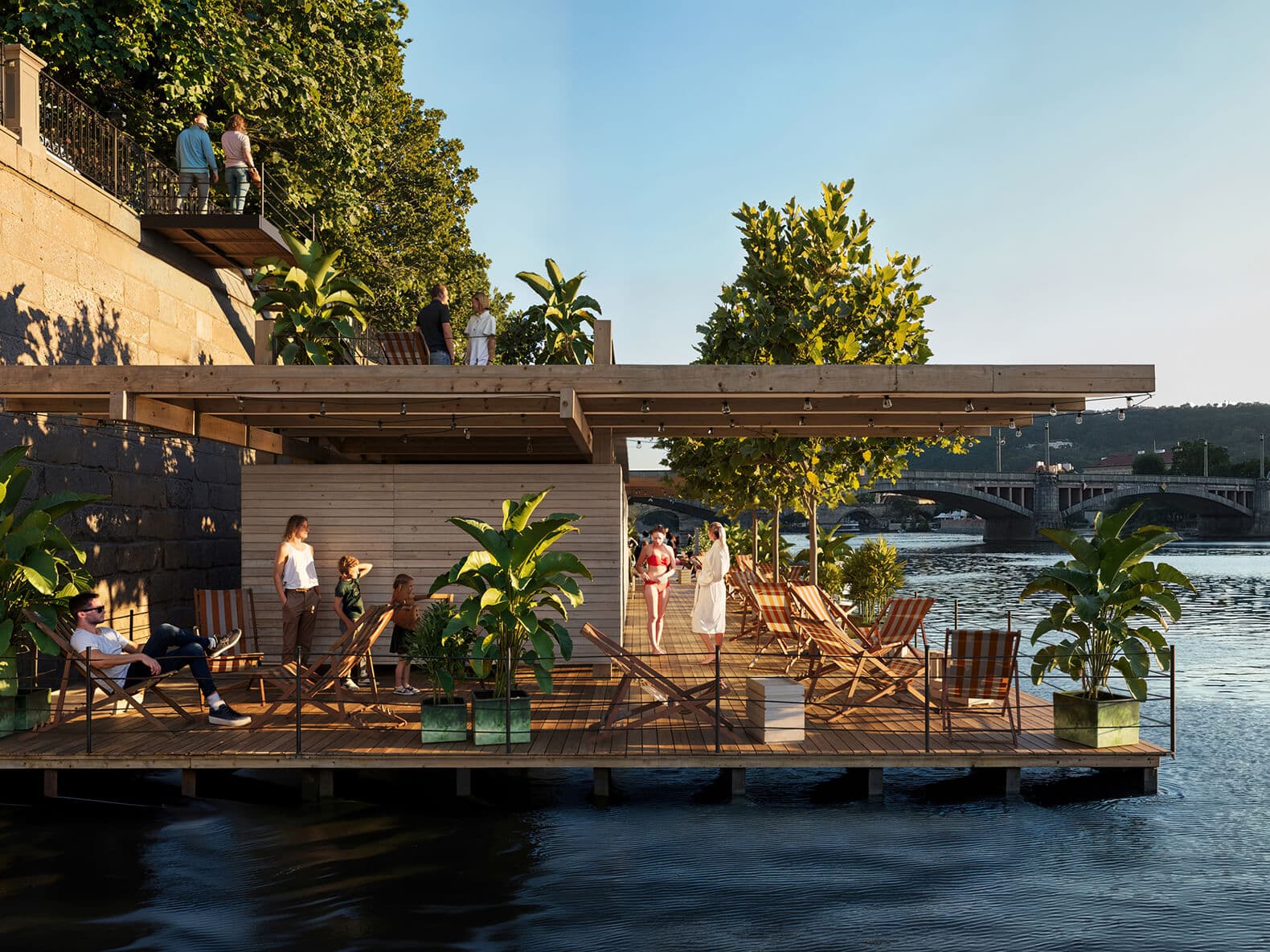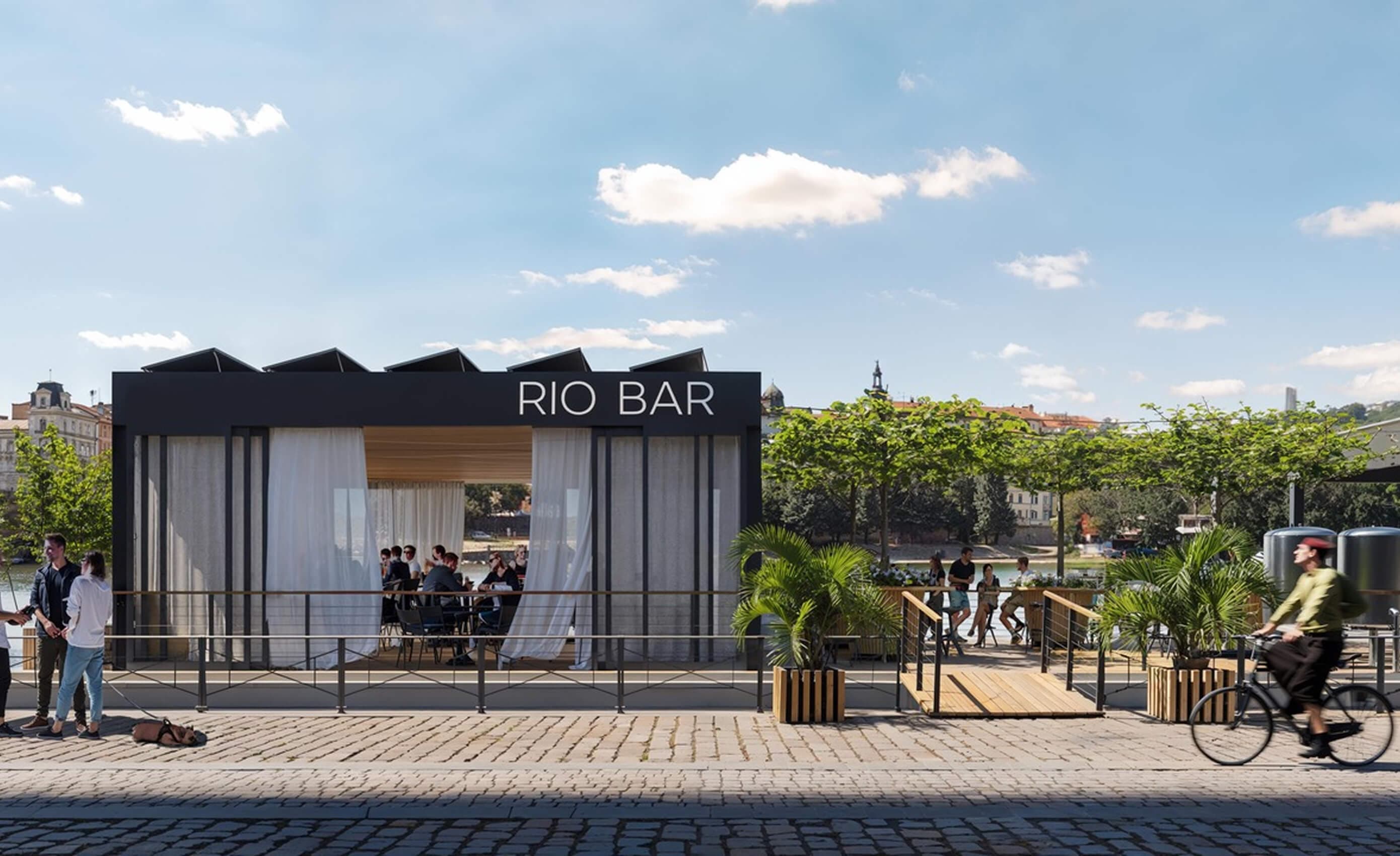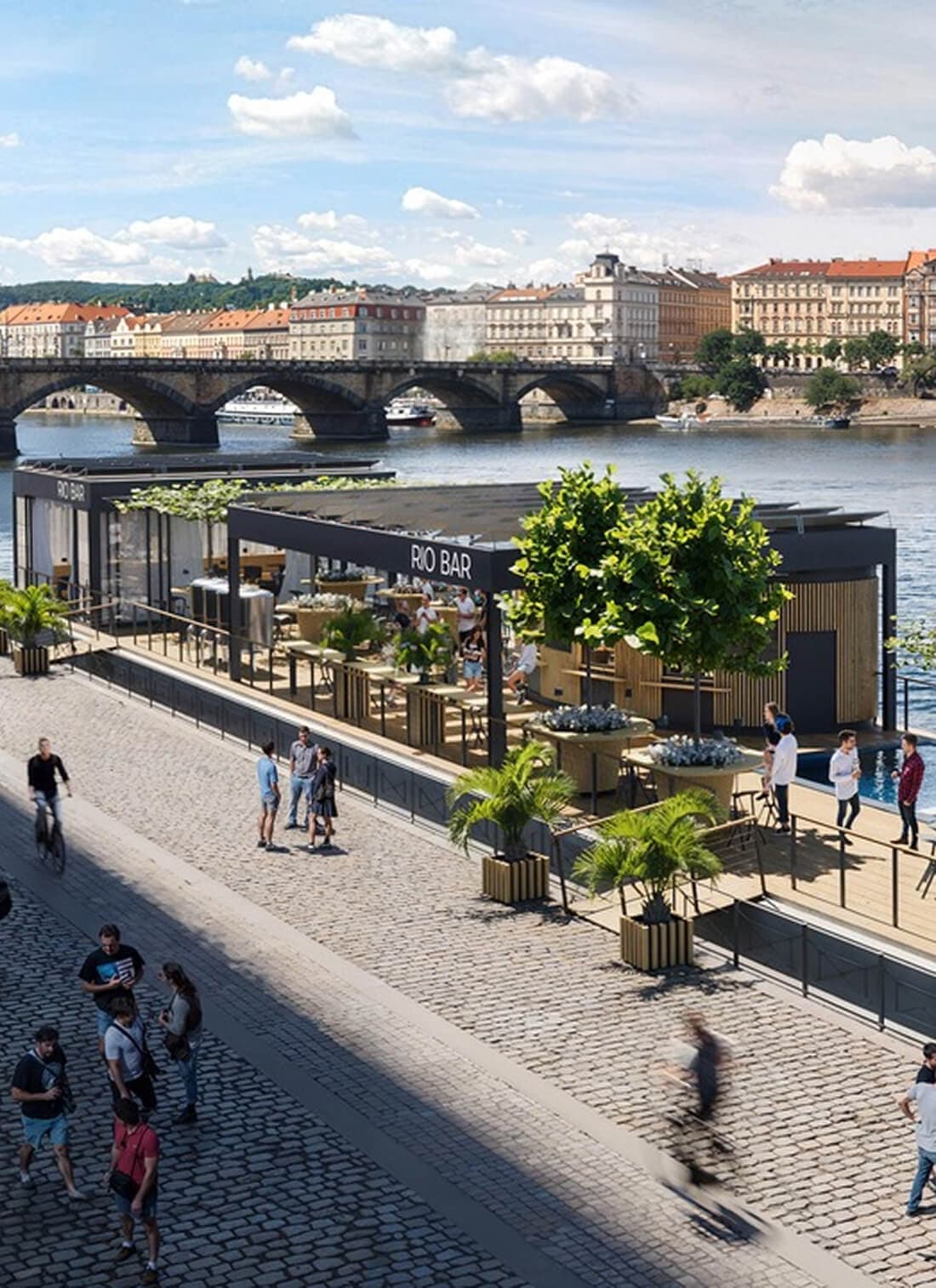 An urban oasis on the Prague riverbank, where the deck bar brings a laid-back, inviting vibe to the city center. The deck stretches out toward the river, shaded by mature trees that offer cool relief on warm days. A gentle touch of Brazil adds character and charm to this unique riverside retreat.