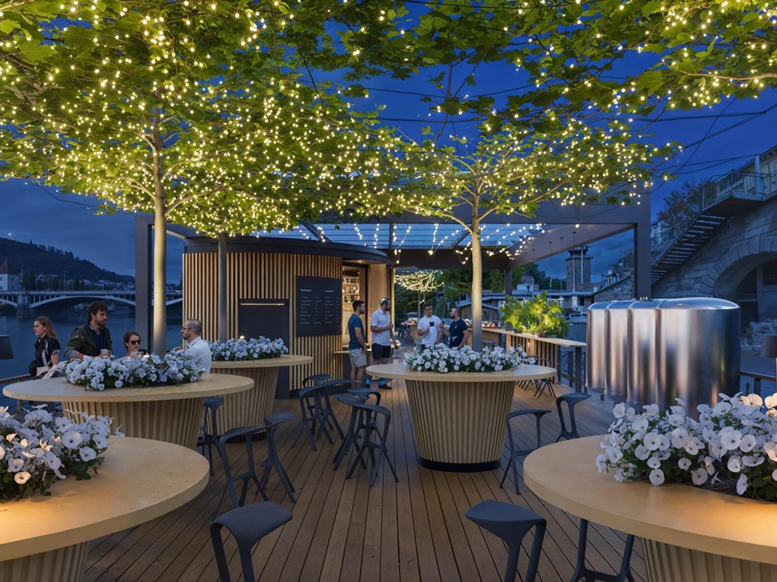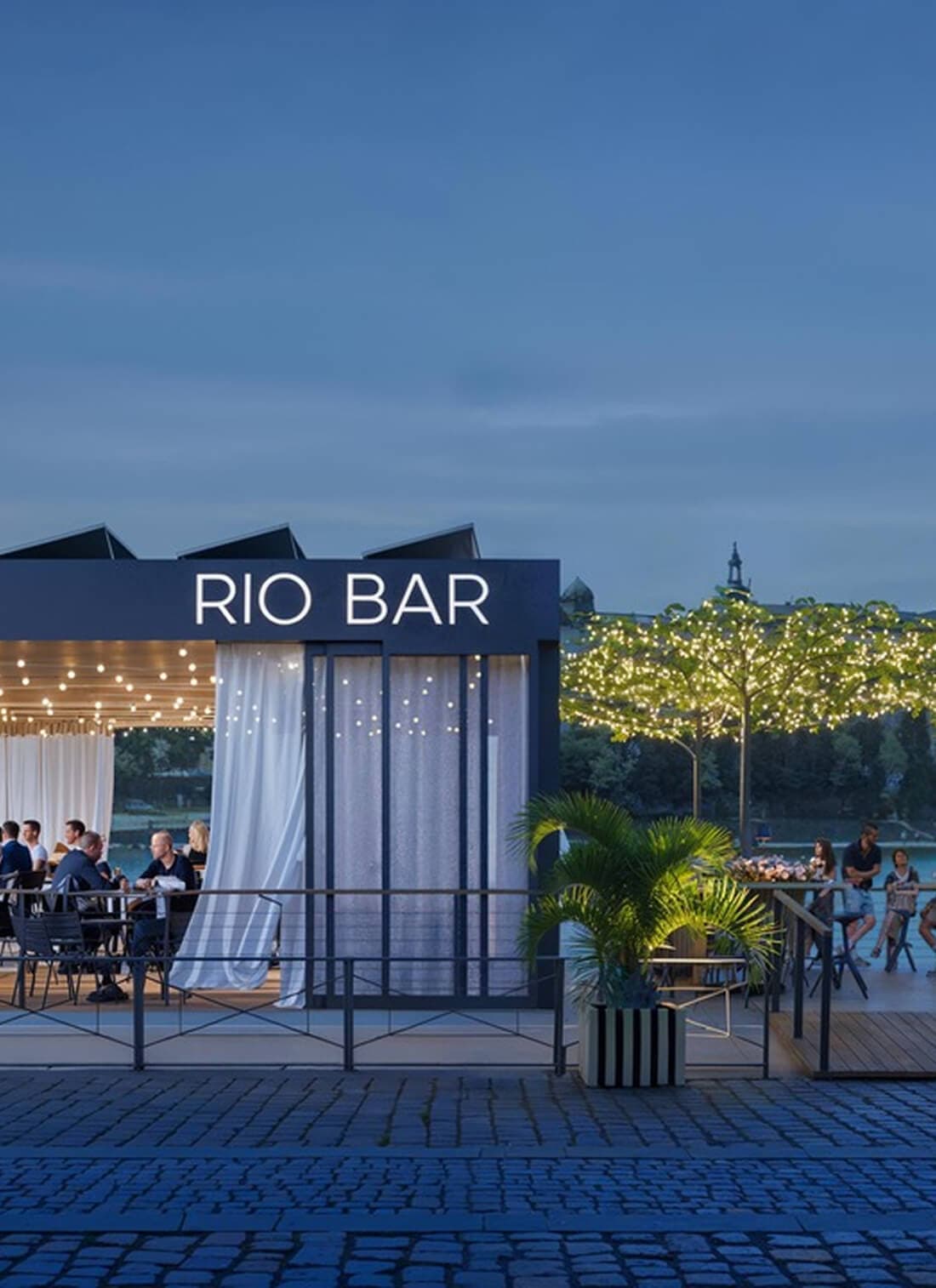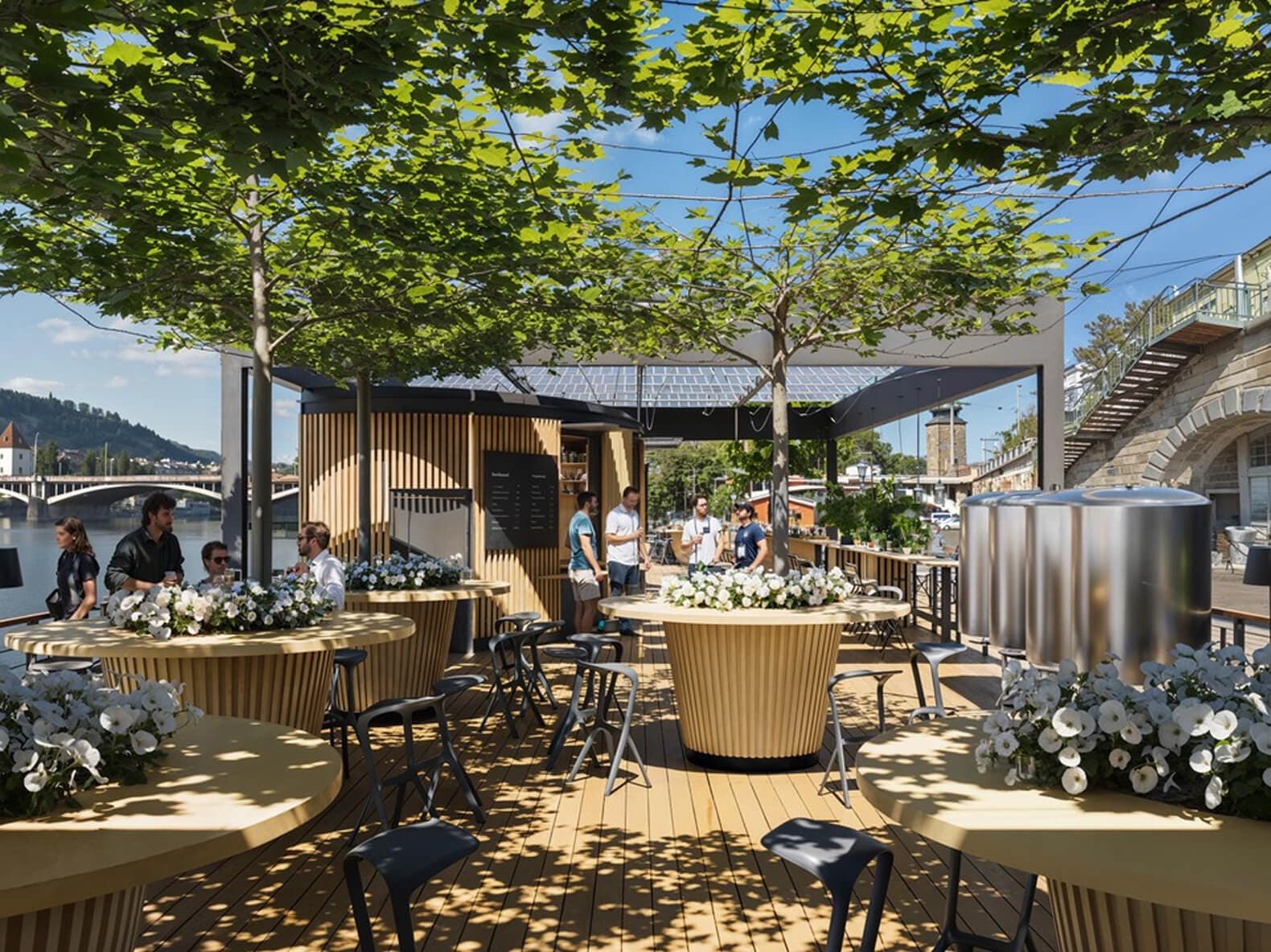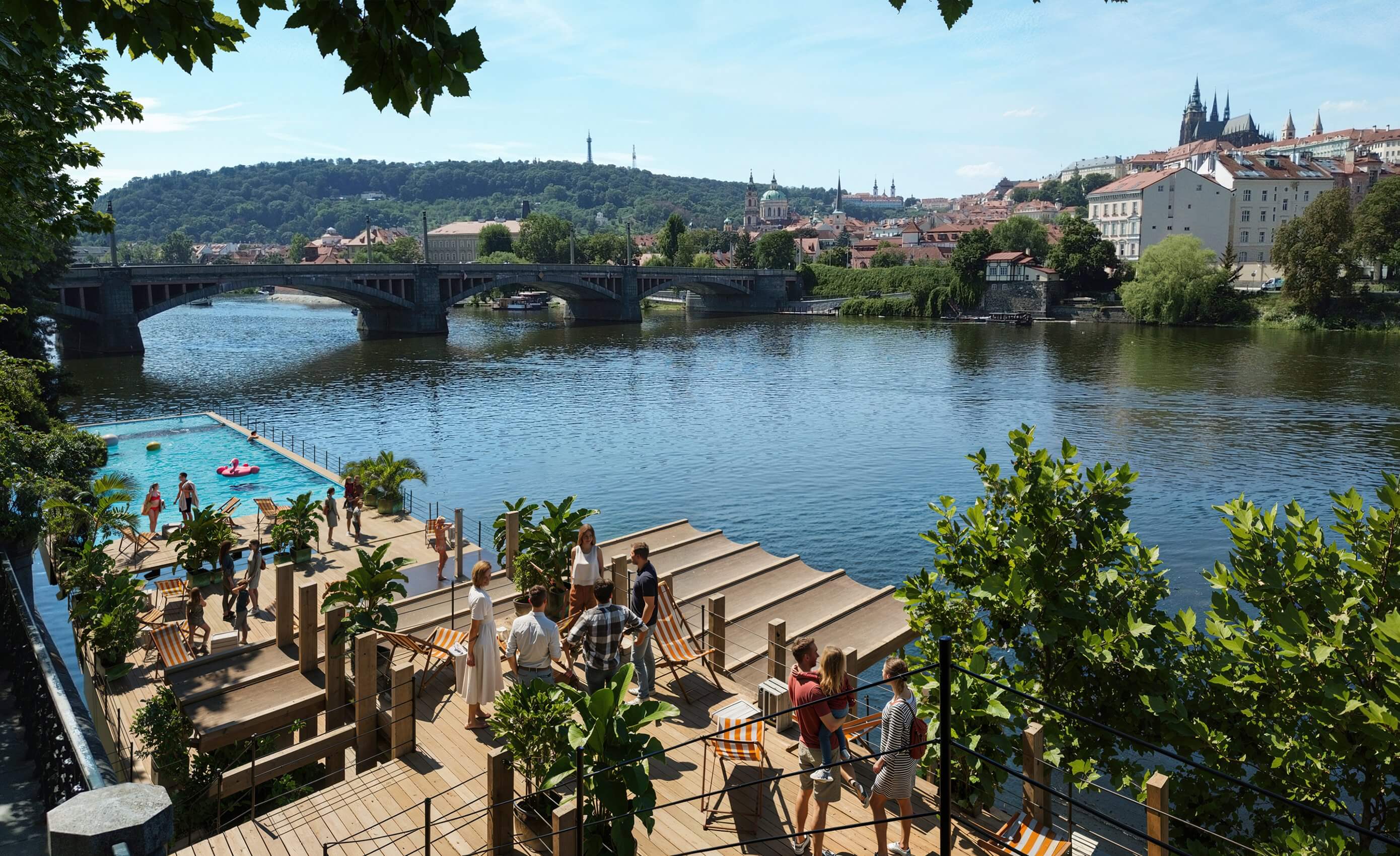 An urban oasis on the Prague riverbank, where the deck bar brings a laid-back, inviting vibe to the city center. The deck stretches out toward the river, shaded by mature trees that offer cool relief on warm days. A gentle touch of Brazil adds character and charm to this unique riverside retreat.