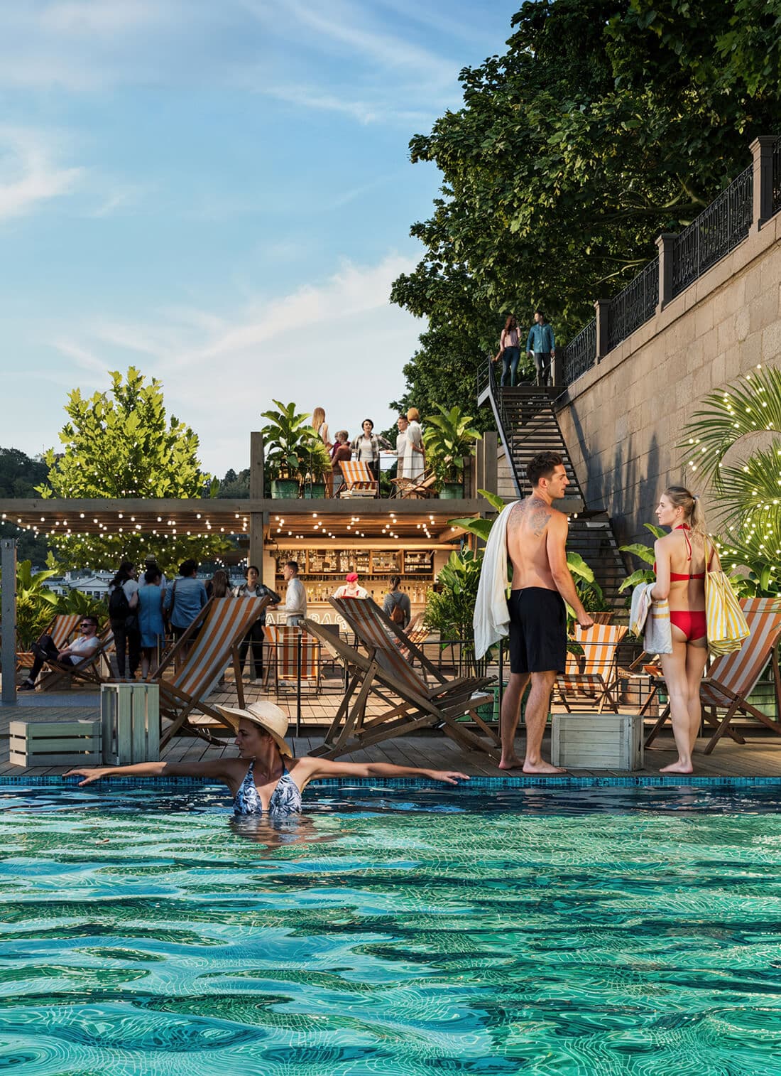The swimming pool offers both open areas for sunbathing and shaded zones beneath a pergola. The wooden structure and classic sun loungers recall the tradition of urban baths — a typology once common, but now absent from contemporary Prague.